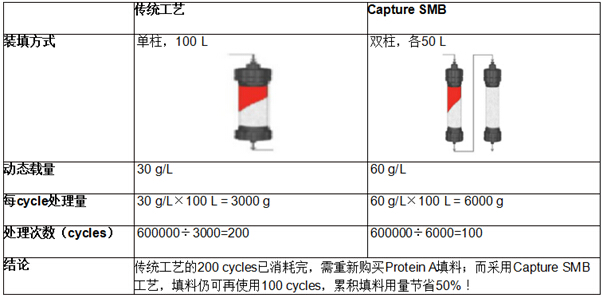 ? ? ?Capture SMB是將第一根層析柱的抗體/蛋白流穿繼續上樣至第二根層析柱,待第一根層析柱完全滿載后,方結束其上樣進行淋洗,并繼續進行洗脫、再生、再平衡操作,而此時第二根層析柱會獨立進行上樣操作。通過切換柱位操作,保證2根層析柱的洗脫、再生、上樣等操作交替銜接進行,從而實現工藝與系統硬件設計的完美結合,使填料利用率最大化,累積用量大為縮減。