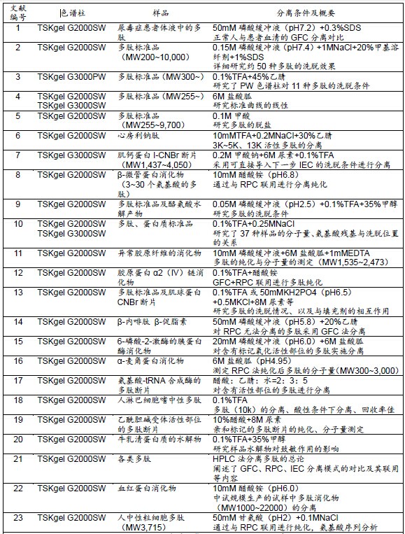 ??? 表1所示為TSKgel色譜柱在采用GFC法進行多肽分離的相關文獻及其概要。