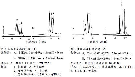 ??? 圖2、3所示為TSKgel G2500PWXL與TSKgel G2000SWXL在分離多肽標準品時的對比圖。通過色譜圖可以明確的看出,TSKgel G2000SWXL吸收峰形與分離帶的寬度均更佳,因此其分離性能更為優異。另一方面,如果多肽的分子量小于1000,由于樣品與填充劑之間的某些相互作用,使用TSKgel G2500PWXL時的分離效果要高于TSKgel G2000SWXL。例如圖2中所示的后葉催產素(MW1007)與亮氨酸-腦啡肽(MW555)、以及圖3所示的TRH(MW362)與甘氨酸(MW75)均顯示了其分離效果高于TSKgel G2000SWXL。