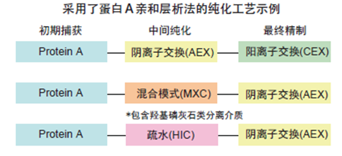??? 不采用蛋白A親和層析法的純化工藝可降低工藝成本。可通過結合使用陽離子交換層析法 ( CEX ) 、陰離子交換 層析法 ( AEX )、疏水相互作用層析法 ( HIC ) 以及混合模式層析法 ( MXC ) 實現對單抗的高純度純化制備。