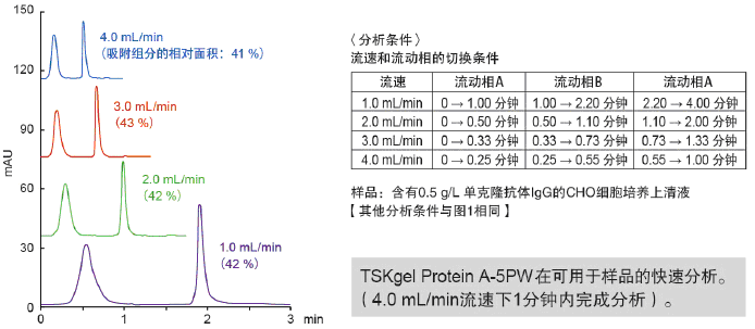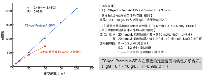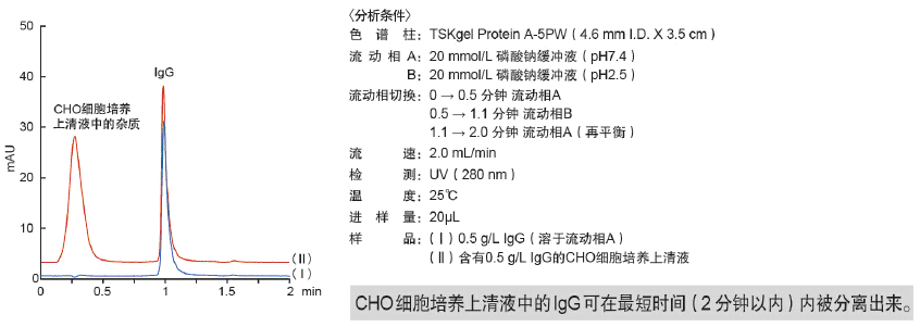 目前,人們對以免疫球蛋白(IgG)為主的抗體藥物的需求日益高漲。在抗體藥物的研發以及制備工藝建設中,由于IgG表達需進行篩選,所以必須快速及準確地定量細胞培養液中的IgG。而且,即使在工業制備過程中,IgG的定量也是重要的質量控制項目之一。為此,日本東曹公司特推出以多孔親水性聚合物為基質,表面鍵合有重組Protein A官能團的TSKgel Protein A-5PW親和色譜柱,用于IgG的快速、高分離度分析。