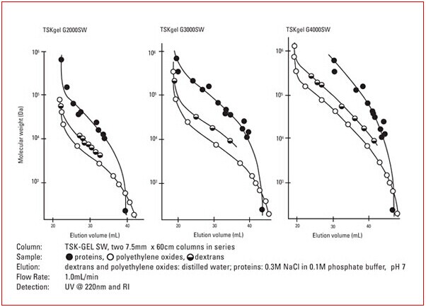 TSKgel SW柱的聚氧化乙烯、葡聚糖和蛋白質(zhì)校準曲線
