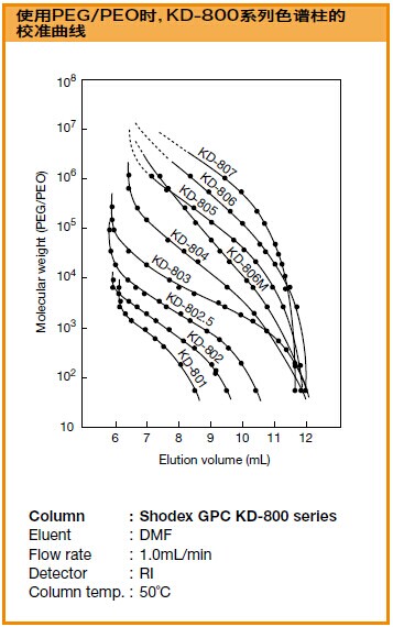 GPC KD-804是標(biāo)準(zhǔn)的油溶性SEC色譜柱,適用于從低分子量到高分子量的寬范圍的樣品。流動(dòng)相是DMF。