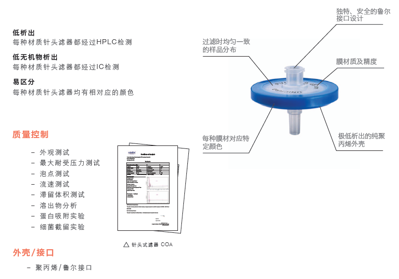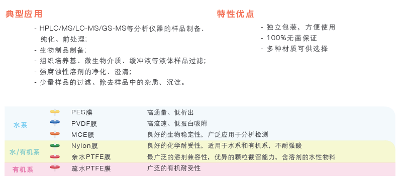 科百特針式過(guò)濾器采用PES/PCDF/Nylon/親水PTFE/GF等濾材,以過(guò)濾不同性質(zhì)的物料,設(shè)計(jì)采用超聲波焊接技術(shù),減少使用時(shí)從側(cè)面漏液的風(fēng)險(xiǎn),同時(shí)每個(gè)針頭根據(jù)膜材質(zhì)的不同而采用不同顏色標(biāo)注,為您提供高效、快速的過(guò)濾選擇!